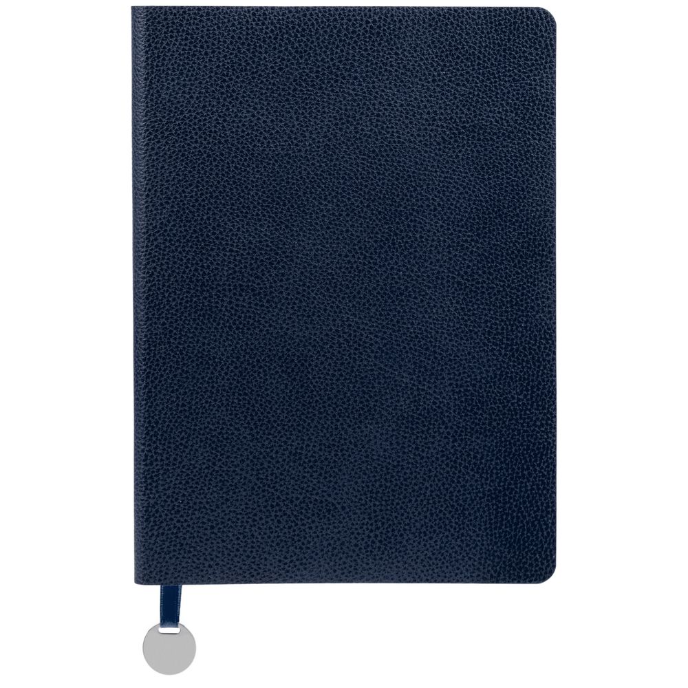 Ежедневник с гибкой обложкой, выполнен из материал La Fite, темно-синий ХХ, дополнен ляссе в цвет обложки с металлическим шильдом.